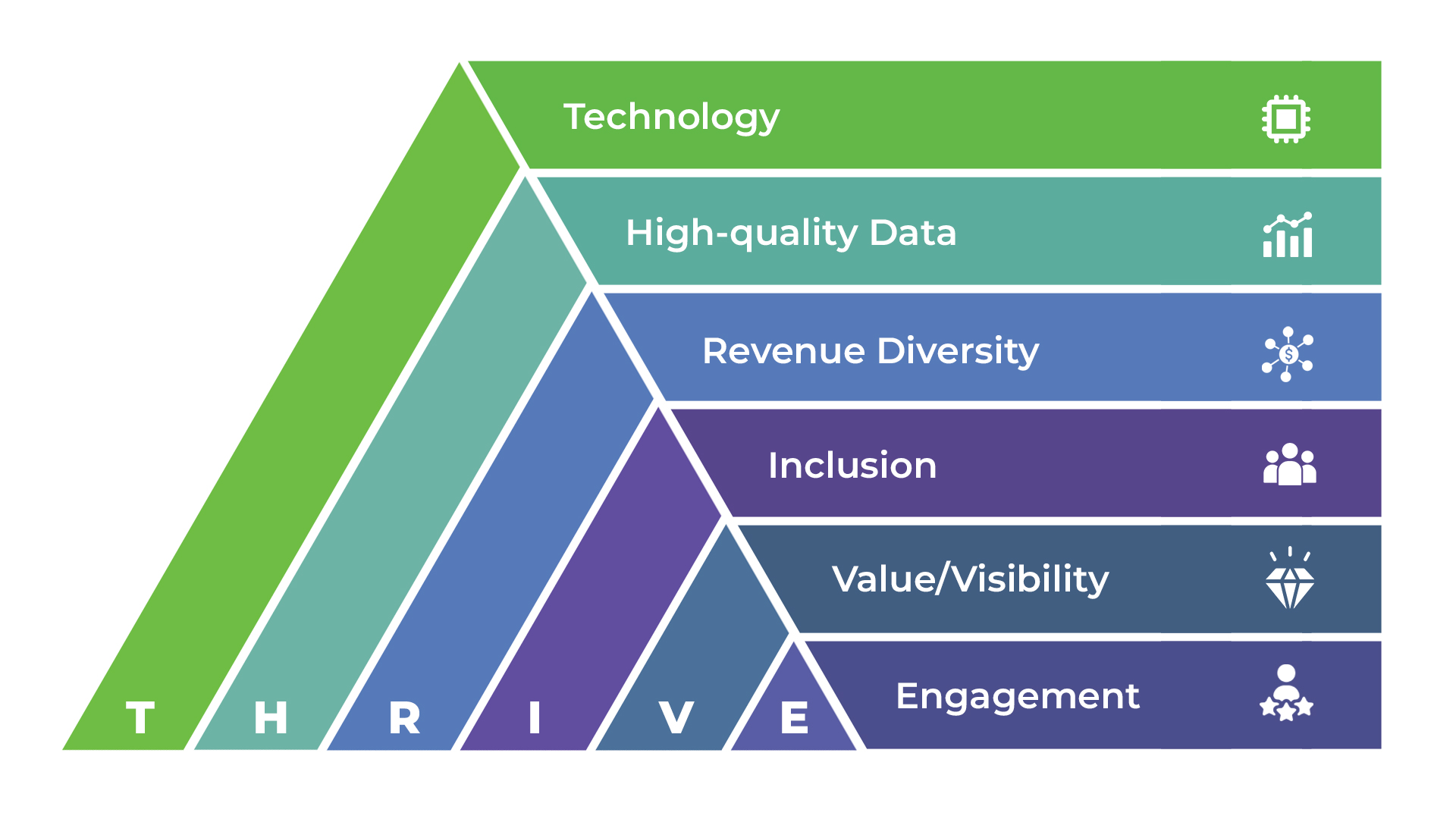 The Continuous THRIVE Model provides a roadmap for associations to overcome operational gaps and embrace continuous growth. It is based on six key components: Technology, High-Quality Data, Revenue Diversity, Inclusion, Value, and Engagement.